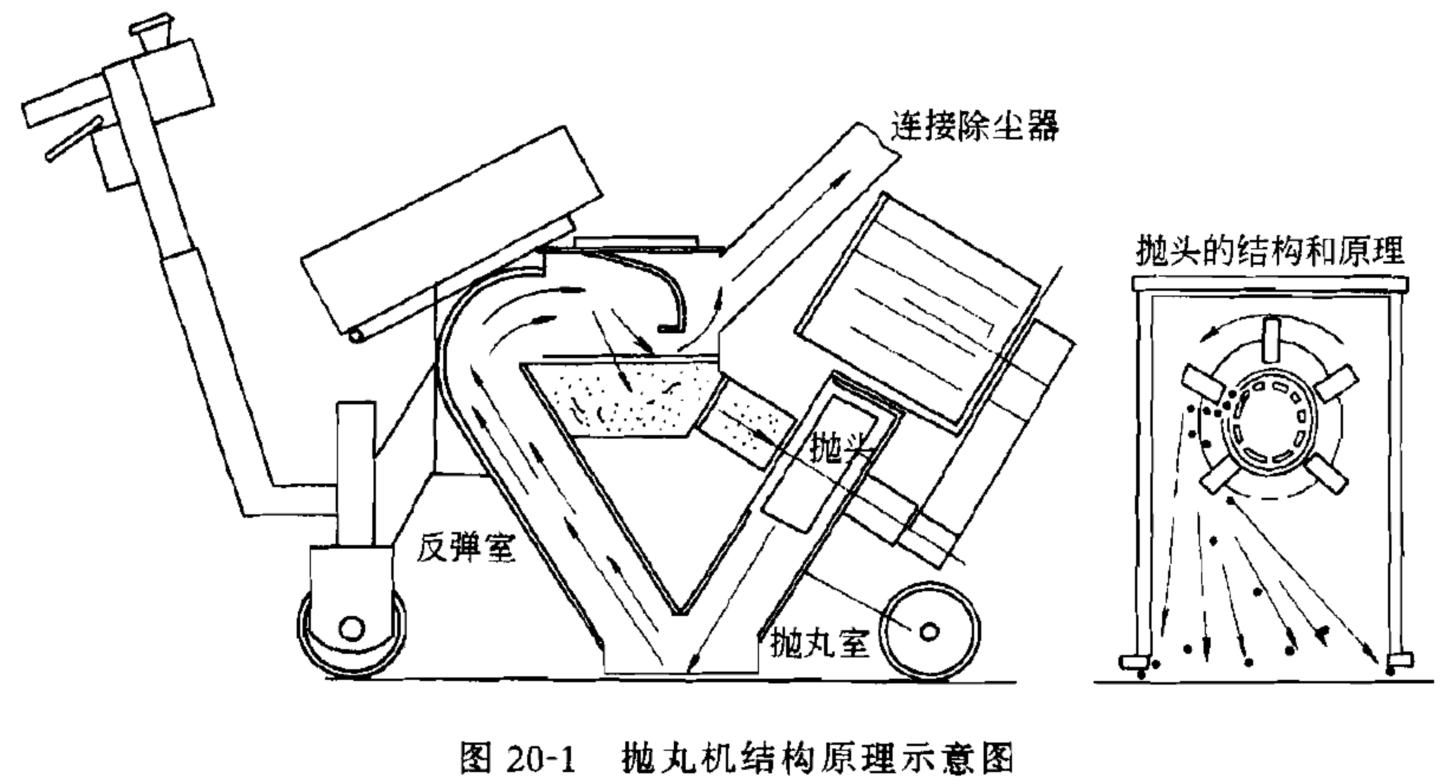 1.拋丸機(jī)拋丸機(jī)是利用電機(jī)驅(qū)動(dòng)的拋丸輪產(chǎn)生的離心力將大量的鋼丸以一定的方向“甩”出,這些鋼丸以巨大的沖擊能量打擊待處理的表面,然后在大功率除塵器的協(xié)助下返回到儲(chǔ)料斗循環(huán)使用。拋丸機(jī)的結(jié)構(gòu)原理見(jiàn)圖20-1。
